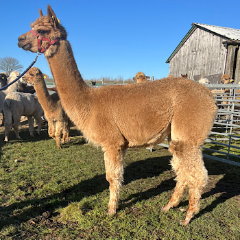 CASUS LADY MARMALADE is a strong solid dark fawn female out of Toft Anna Jool and TOFT Agamemnon. Lady M is a is a well conformed female with a very balanced strong frame who despite being a bit older in style produces very modern solid coloured cria with compact balanced conformation.